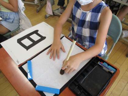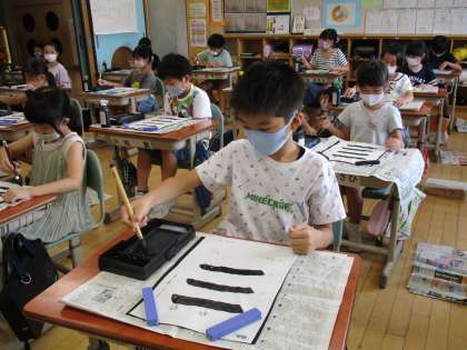 3年生から学習を始めた書写の時間。習字も大分慣れてきました。よこ画、たて画の練習の後に、「日」の字を書くために、「おれ」の筆の使い方を練習しています。満足がいく字が書けたかな。