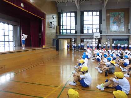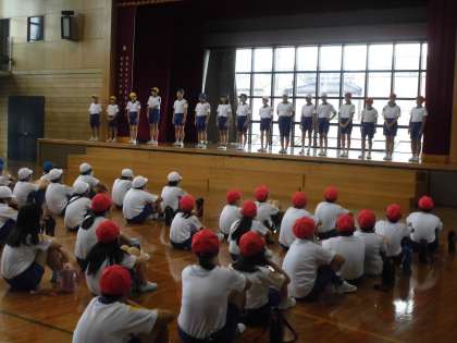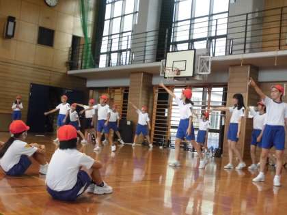 9月7日(月)に、5、6年生で結団式をしました。始めに、運動委員会の委員長が、運動会のスローガンを発表しました。次に、各団の団長、副団長、応援団長、応援副団長が挨拶をしました。最後に、団ごとに応援練習をしました。6年生が、一生懸命に5年生に伝えようとする姿が印象的でした。