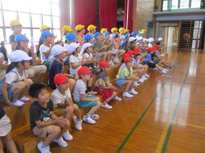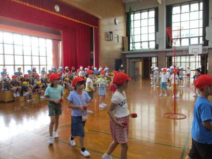 運動会に向けて玉入れの練習をしています。今日は、1年生のみなさんに入退場の仕方のお手本をしました。1年生が練習しているときには、拍手や手拍子をして応援の気持ちを表す優しい子供たちの姿が見られました。