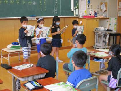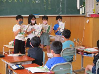「やくそく」では、登場人物の台詞を確かめたり、気持ちを考えたりしながら学習を進めてきました。まとめでは、登場人物になりきって、班ごとに音読発表をしました。