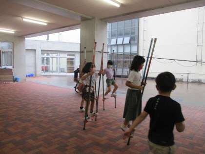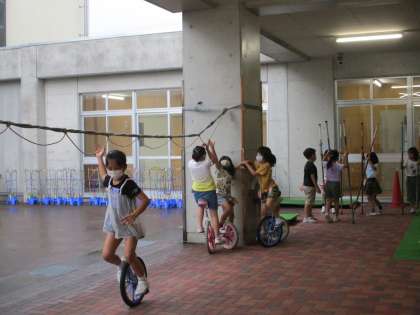 雨の日に体を動かしたい子供たちに人気なのは、中庭の遊具です。竹馬や一輪車がめきめき上達しています。