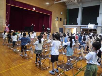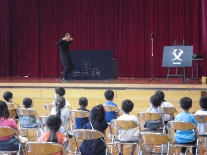 9月30日(水)に、富山県巡回劇場が公演されました。題目は、はせがわ天晴による『マイムの時間』です。身の回りにあるものや人の心情を体で表現する演技を、子供たちは食い入るように見ていました。また、「パントマイム教室」では、体の動かしのこつを教わり、上手に表現しようとがんばっていました。