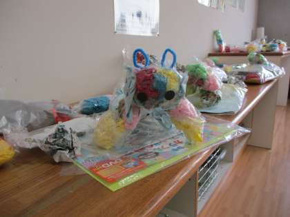 3年生は、図工かで「カラフルフレンド」という作品作りに取り組んでいます。透明の袋の中に色とりどりの色紙や、おはながみを詰めて、生き物を作っています。魚や動物、鳥などの思い思いの作品に楽しみながら取り組んでいます。