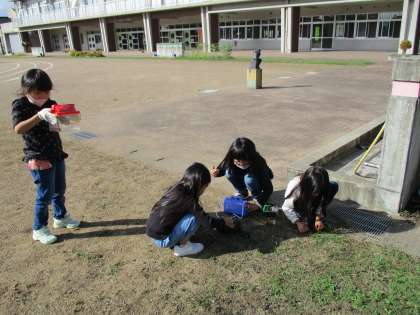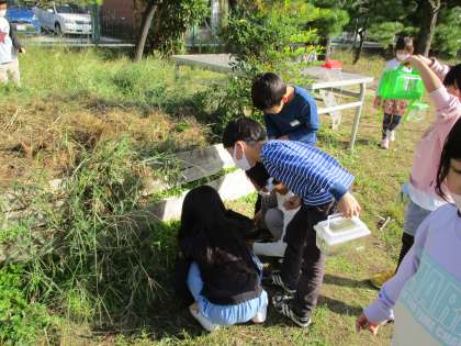 5時間目には、育てるためにどのようなことが必要か話し合いました。本で調べたり、生き物に詳しい友達に聞いたりしながら、グラウンドで食べ物やすみかになるものを準備しました。