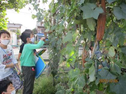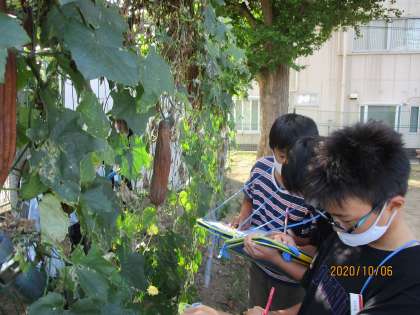 理科の学習では、すずしくなって植物の様子はどのように変わっているのかという課題をもって、夏に観察したヘチマの様子を見にいきました。茎の長さや、実の大きさ、色など多くのことに気付くことができました。