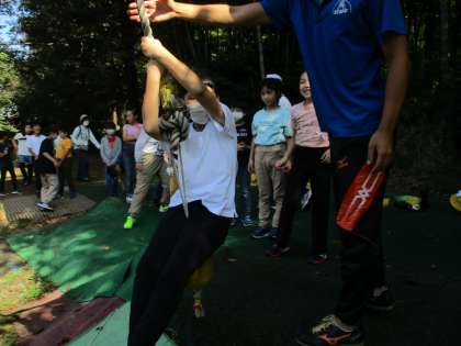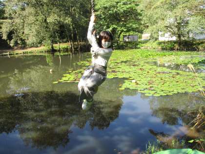 ロープにつかまり、池に向かって飛び出す「ターザンロープ」は子供たちに大人気。やる前には怖がっていた子供たちもいざチャレンジすると、そのおもしろさがやみつきになり、何度もやりたいと列をつくっていました。