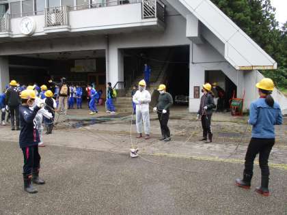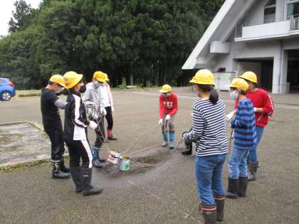 午後の活動は「立山ジョイフレンド」です。4つのミッションを達成するために仲間と協力しました。1つ目は「危険物処理班」。缶の中に入った液体を缶につないであるロープで動かしながら別の容器に移し替えます。お互いに声を掛け合いながら試行錯誤しました。