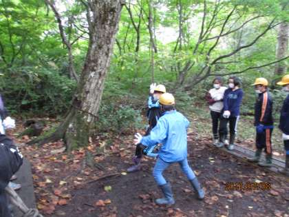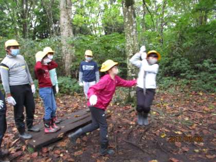 3つ目の競技は「ターザンロープ」です。島から島へロープを使って渡りました。アシストをする子供、渡ってきた友達を支える子供、ロープのつかみ方や着地の仕方を友達熱心に教える子供。みんなで協力して達成しました。