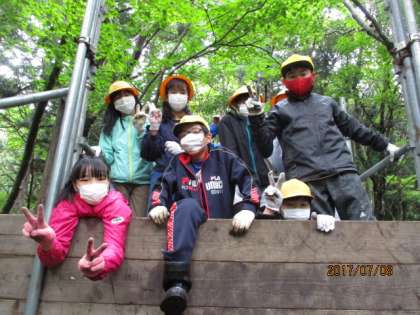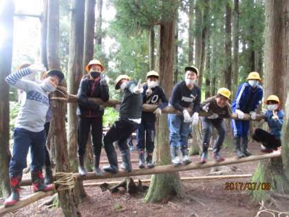5班と6班の様子です。5班は森の遊び場づくりで丸太を支える人、縄で縛る人、指示を出す人と役割を分担し、大きなアスレチックをつくりました。6班は危険物処理班では圧倒的なスピードでクリアするなどチームワークのよさが目立ちました。