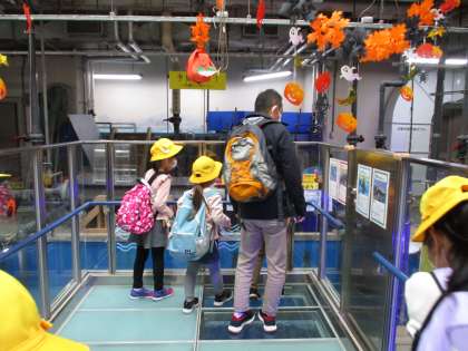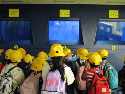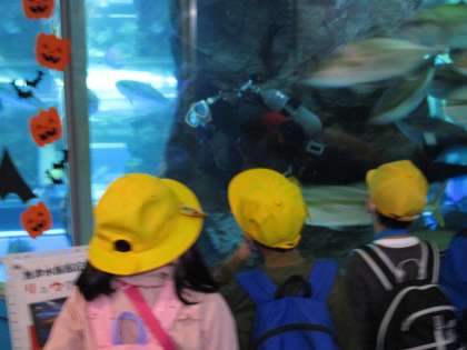 特別に、お休み中のお魚ショーを見せていただき、上手に輪くぐりをするシマダイに歓声をあげたり、拍手喝采したり、とても盛り上がっていました。