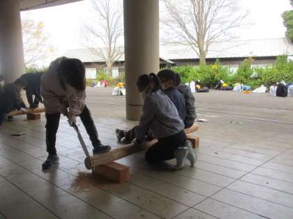 グループで協力しながら丸太をのこぎりで切ったり、切った木に自分で絵を描いたりして、オリジナルのコースターが出来上がりました。
