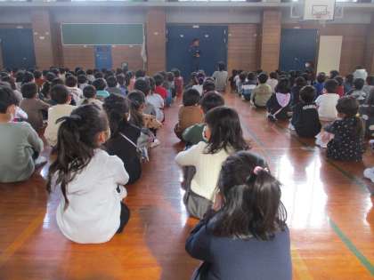 11月10日(火)に休み時間の火災発生時の避難訓練がありました。富山市消防局の方が様子を見に来られ、その後お話をしていただきました。静かに放送を聞き、落ち着いて体育館に避難することができました。