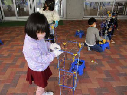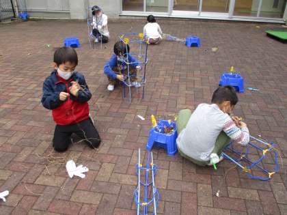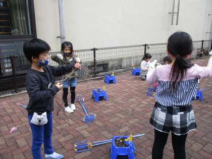生活科の学習で育てたアサガオのつるを使ってリースをつくりました。支柱から外す作業や丸い輪をつくることに苦労しながらも、がんばってつくってしました。飾り付けるのが楽しみです。