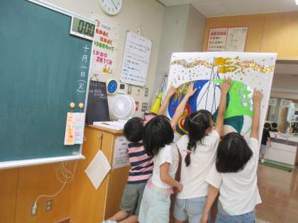 学習発表会で使う道具をつくりました。友達と協力して「お客さま」役の衣装や船の絵が完成しました。