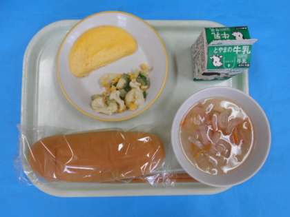 この日は、コッペパン、ぎゅうにゅう、マカロニスープ、カラフルサラダ、チーズオムレツでした。