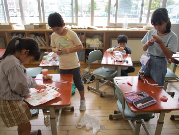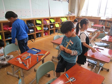 生活科の学習では、おもちゃづくりをしています。ゴムを生かしたおもちゃをつくると、どんなふうに動くのかを試す姿が見られました。