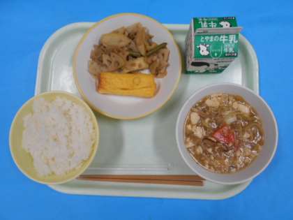 今日のメニューは、ごはん、ぎゅうにゅう、とうふのやさいあんかけ、れんこんとまこもたけのきんぴら、たまごロールです。れんこんはしゃきしゃきとしたしょっかんをたのしみながらいただきました。