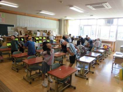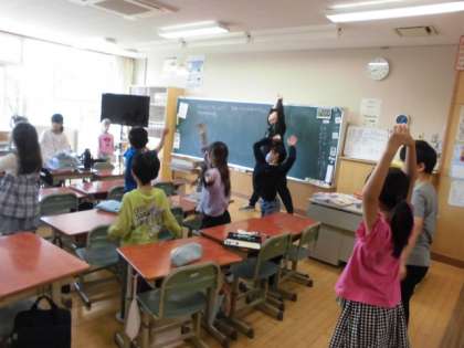 気持ちのよい朝。子供たちと一緒に先生もラジオ体操をしています。