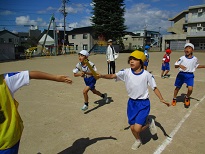 体育科では、走の運動遊びとして、リレーに取り組んでいます。1位を目指して、バトンパスやコーナーの走り方等を考えました。