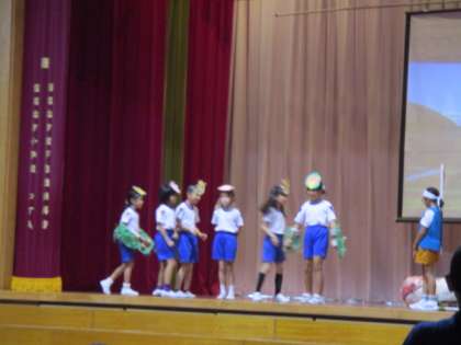 学習発表会で英語劇「桃太郎〜 The Peach Boy 〜」を披露しました。笑顔で元気よく演じる姿からは、観客を楽しませるだけでなく、自分たちも楽しんで演じようとする気持ちが感じられました。一人一人が役になりきって、3年生の魅力をつめこんだ桃太郎の世界観を表現していました。