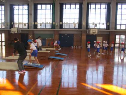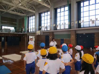 1学期のマット運動で学習した「動物歩き」を生かして、跳び箱を跳ぶ姿勢を練習しました。子供たちは、「4段跳べたよ」「もっと高い跳び箱に挑戦したい」と振り返っていました。