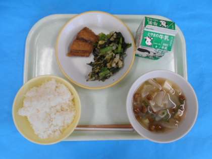 この日のメニューは、ごはん、ぎゅうにゅう、なめこじる、いそあえ、あげざかなのレモンあじでした。いそあえは、のりがたっぷりとあえてあり、とてもおいしくいただきました。