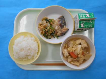今日のメニューは、ごはん、ぎゅうにゅう、たまごとじ、いりだいずあえ、さばのみそにです。みそには、さばのうまみがよくでてとてもおいしかったです。