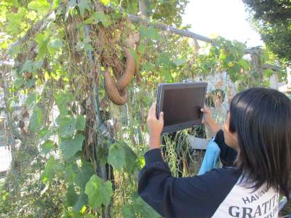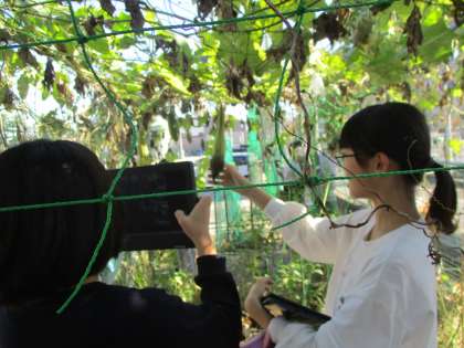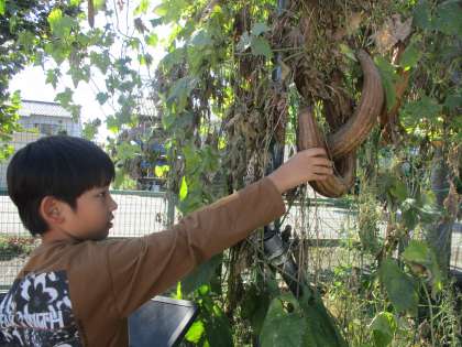 理科では、育てていたヘチマの様子について観察しました。夏の頃と比べて、「ずいぶん葉がかれているよ」「茶色い実がたくさんあって、軽いよ」と葉や枝の様子に気付いたり、実を触って重さを確かめたりして植物の様子の変化を感じ取ることができました。