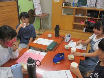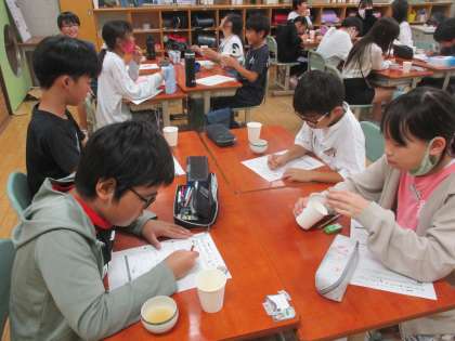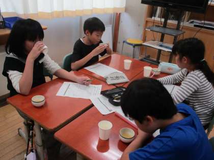 家庭科の「食べて元気!ご飯とみそ汁」の学習で、だし入りのみそをとかした物とだし無しのみそをとかした物の飲み比べをしました。日本の伝統的な料理である味噌汁の飲み比べをして、子供たちは香りや見た目、色、味の違いに気付いていました。来週は実際に実を入れて味噌汁を作ったりご飯を炊いたりします。