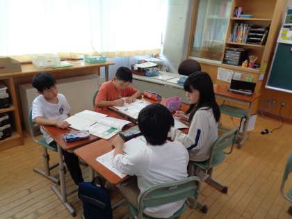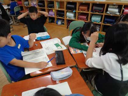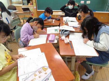 算数の時間は、自分たちで教科書をもとに、それぞれの学習を進めています。集まる人数も自由で、友達と教え合ったり、1人でじっくり取り組んだりしながら、学んでいます。