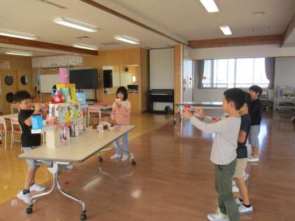 友達と「わくわく作戦会議」で話し合ったり、つくりながら試したりして、おもちゃや遊び場所が少しずつできあがってきました。次回は2年生でおもちゃ遊び交流会をします。