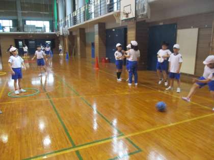 今日はメインゲームの形で練習をしました。攻撃と守備に分かれ、アウトゾーンを2つ作り、アウトにする場合の動きや、ボールを蹴った後の動きをしました。振り返りでは「ボールを蹴る方向をコントロールしたい」「うまくキャッチができなかったので、チームで協力したい」などと作戦を考えて、次のゲームに臨みます。