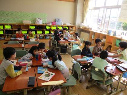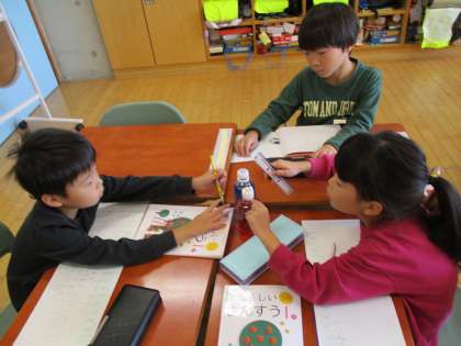 算数科「どちらがおおい」の学習では、形の違う入れ物に入っている水の量を比較しました。見た目や持ったときの感覚から予想を立て、自分なりの方法を考えて比べていました。
