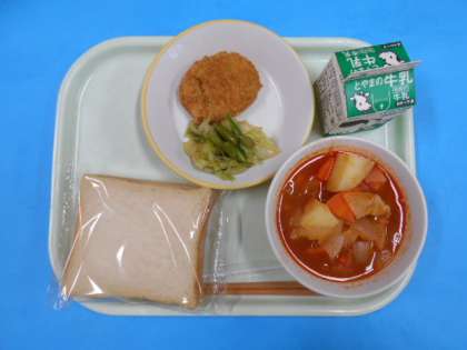 今日のメニューは、しょくパン、ぎゅうにゅう、ポークビーンズ、アスパラサラダ、かぼちゃコロッケです。コロッケは、かぼちゃのあまさをかんじることができ、とてもおいしかったです。