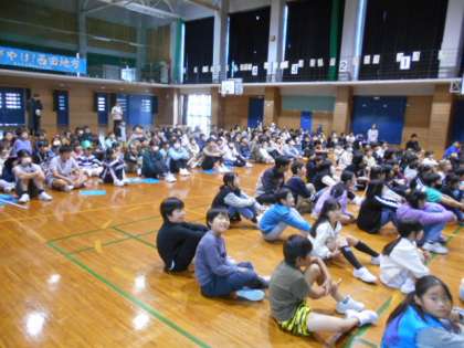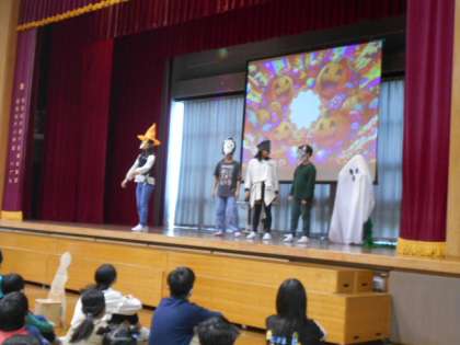 集会委員会によるハッピーハロウィン集会が行われました。会場には、仮装?した子供たちもいました。