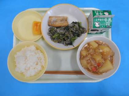 今日のメニューは、ごはん、ぎゅうにゅう、じゃがいものそぼろに、よごし、にしんのみぞれに、かきです。にしんのみぞれには、くさみもなくさっぱりとしており、とてもおいしかったです。