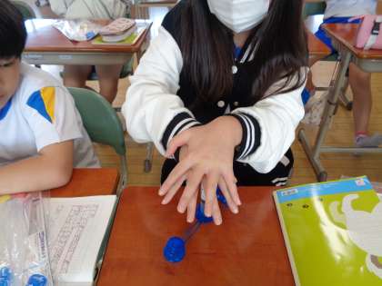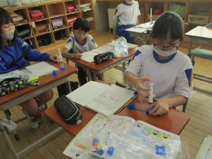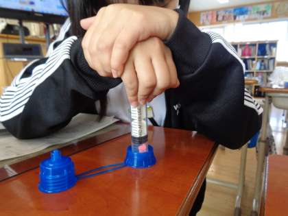 理科の時間に、とじこめた空気の体積の変化について学習しています。注射器のつつの中にとじこめた空気を押してみました。「ピストンがさがったよ」「手を離したらピストンがもどってきたね」と、ピストンの手応えを確かめていました。