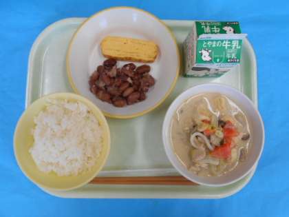 11月8日のメニューは、ごはん、ぎゅうにゅう、ごまとうにゅうなべ、にまめ、あつやきたまごでした。
