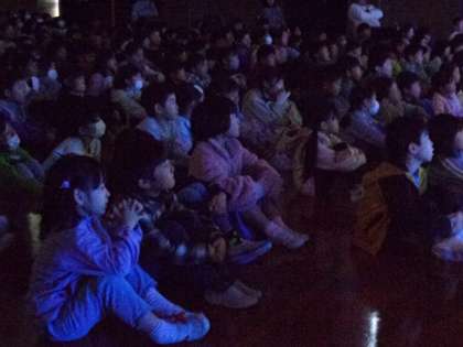 11月8日(金)、子供たちは「ふしぎの国のアリス」の影絵劇を鑑賞しました。体育館に足を踏み入れた1年生は、体育館のセットを見て思わず「すごい!」と声を漏らしていました。