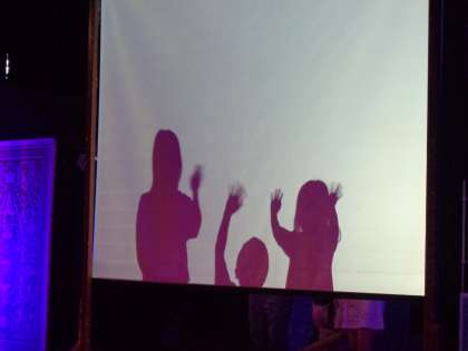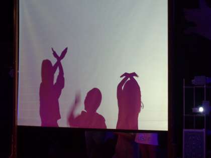 また、スクリーンで影絵をつくってみたい子供を募り、代表の2名が、手を柔らかく動かして、羽ばたいている「鳩」の影絵を表現しました。