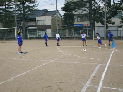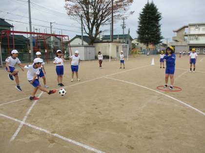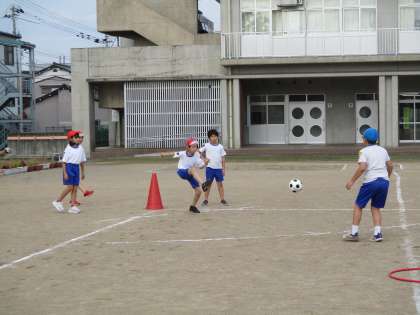 気持ち良い秋晴れの下、久しぶりの外での体育に子供たちは張り切っています。キックベースボールの学習では、初めて外でゲームをしました。室内とは違って、塁までの距離や外野の動きなどを考えてチームで協力してアウトにしたり、ボールを蹴る方向を工夫したりして対戦しました。振り返りでは、「もう一度チームで作戦を立てたい」と次の試合へ意欲を高めていました。