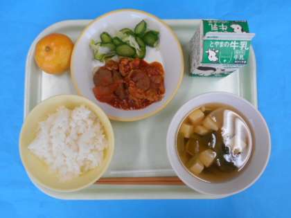今日のメニューは、ごはん、ぎゅうにゅう、すましじる、そえやさい、ぶたにくとレバーのケチャップソースいためです。ケチャップあじでおいしくちょうりされていたレバー、こどもたちから「レバーおいしかったよ」ときかれました。