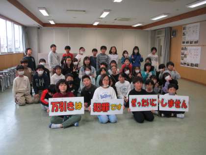 少年警察ボランティアの方が来校され、万引き防止教室が開かれました。DVDを見て、登場人物の気持ちを考えるグループディスカッションをしました。「仲のよい友達でも、悪いことはだめと断る勇気をもちたい」「悲しむ人がいることが分かった」と、グループごとに発表をしました。4年生として、これからどんな行動をとればよいのか、深く考える時間になりました。