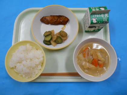 今日のメニューは、ごはん、ぎゅうにゅう、ぐだくさんじる、だいこんのえごまサラダ、ふくらぎのてりやきです。きょうからさむくなってきました。ぐだくさんじるでからだがあたたまりました。