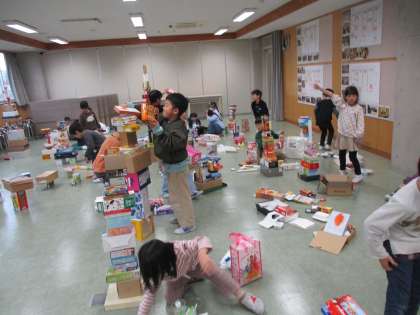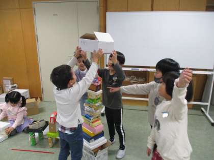 学習参観でご覧いただいた「かたちあそび」の学習の続きをしました。前回、途中で崩れてしまった物があったことから、「同じ大きさの物を並べないとくずれてしまう」「下には固い箱を使うようにした方がくずれにくい」など、大切な気付きが生まれました。その気付きを基に、再度材料を集めたり、組み立て方を工夫したりしながら、かたちあそびを楽しみました。