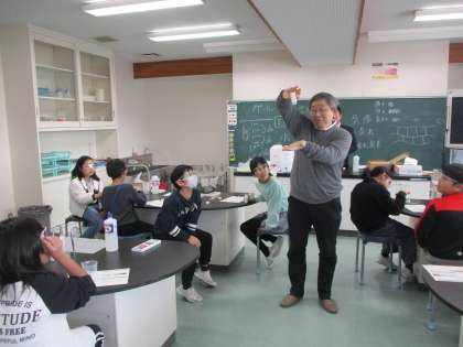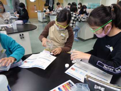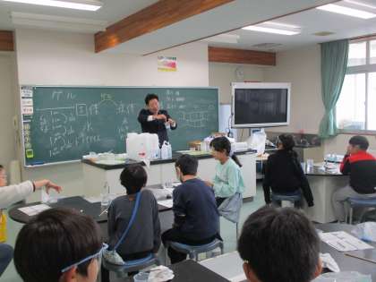 県立大学の教授を招いて、「きらめきエンジニア おもしろ科学実験」が行われました。「固体と液体の中間の性質 ゲル」について、教授から、話を聞いた後は、お楽しみの実験です。まずは、実験1「おむつの中のゲル、水を吸わせてみよう」では、1グラムのゲルが入った瓶の中に水を入れて、どんどん膨らむ様子にびっくり。瓶をひっくり返しても、ゲルはこぼれませんでした。