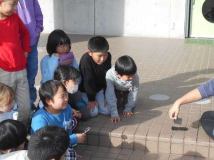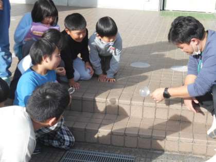 理科の学習で、虫めがねをつかって光を集める実験を行いました。集まった光が小さくなると、煙がでて紙が焦げていくことに、子供たちはびっくり。「すごい」と言いながら、自分たちでも試していました。