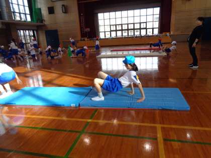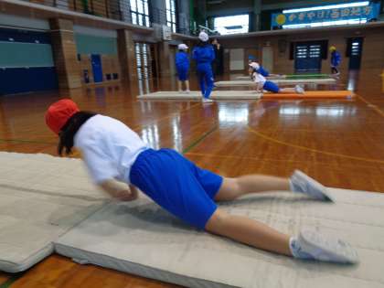 体育でマット運動に取り組んでいます。「久しぶりだ」「体がになかなか動かない」といいながら、まずは、動物歩きで体を慣らしました。そして、前転と後転に取り組み、徐々にマット運動での体を動かし方を思い出していました。