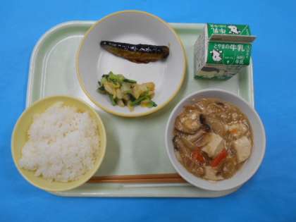 今日のメニューは、ごはん、ぎゅうにゅう、とうふときのこのあんかけ、はくさいひたし、いわしのしょうがあじです。きのこのあんかけは、あきのおいしさをかんじました。
