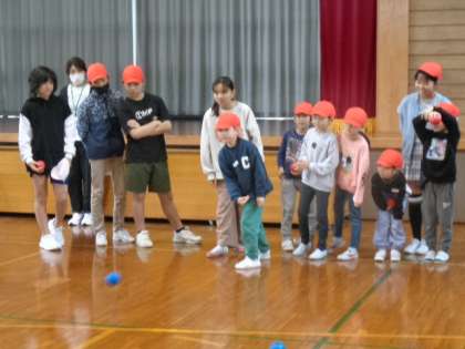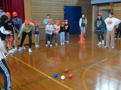 運動委員会のイベントで、「ボッチャ」というゲームを6年生と一緒にしました。赤チームと青チームに分かれて、一人一つずつ玉を転がして、勝敗を競いました。初めて行うゲームでしたが、6年生に声をかけてもらいながら、ゲームを楽しんでいました。